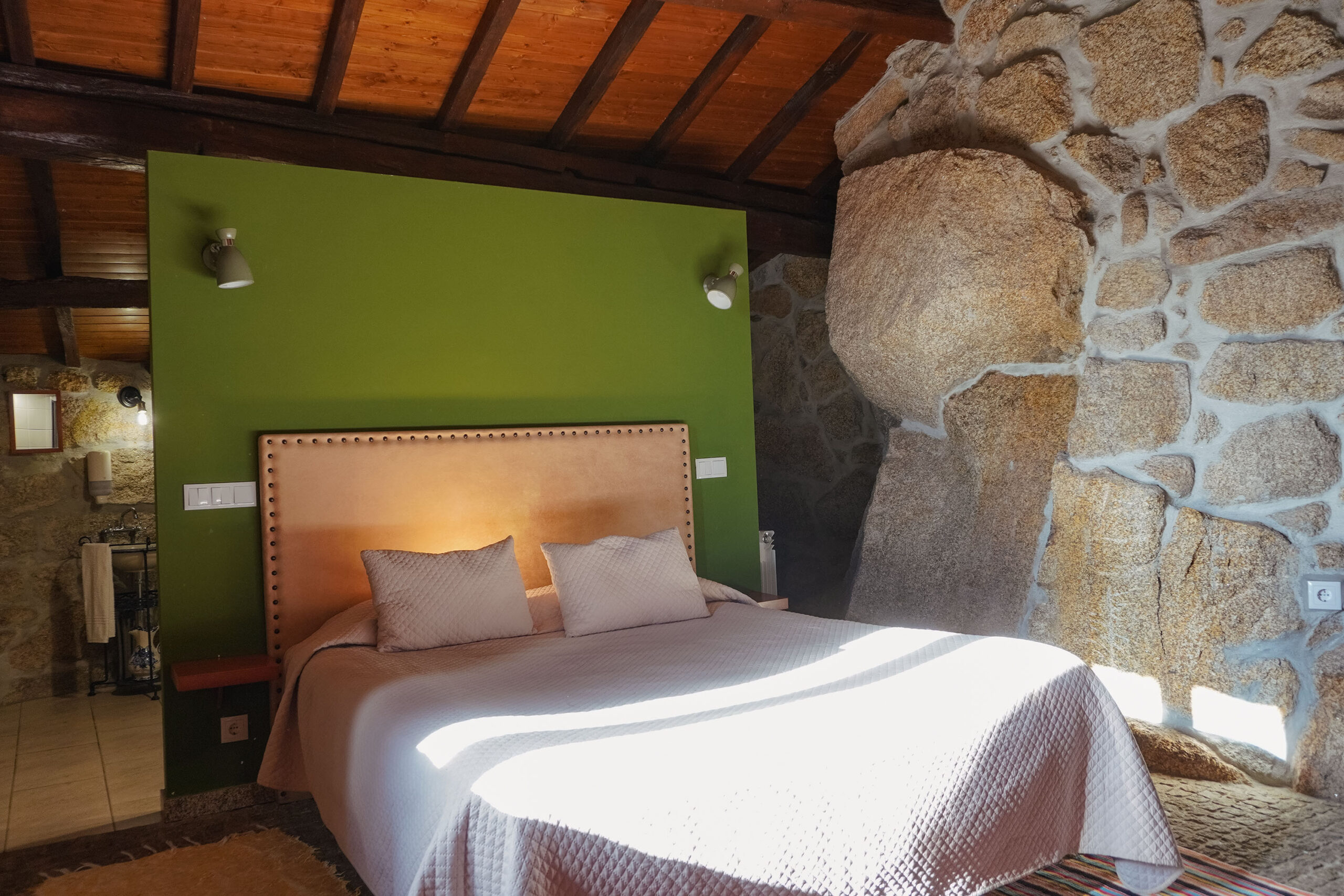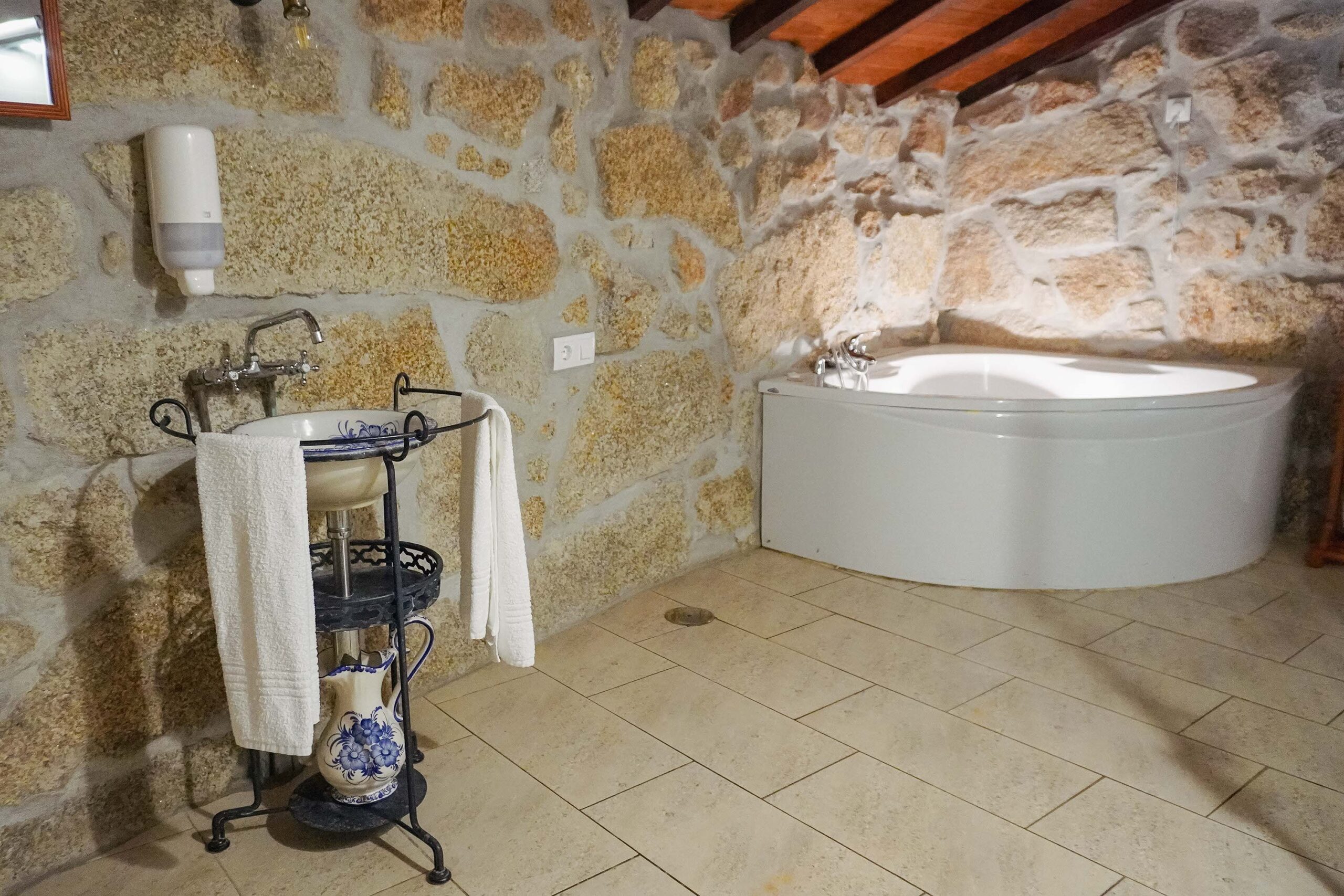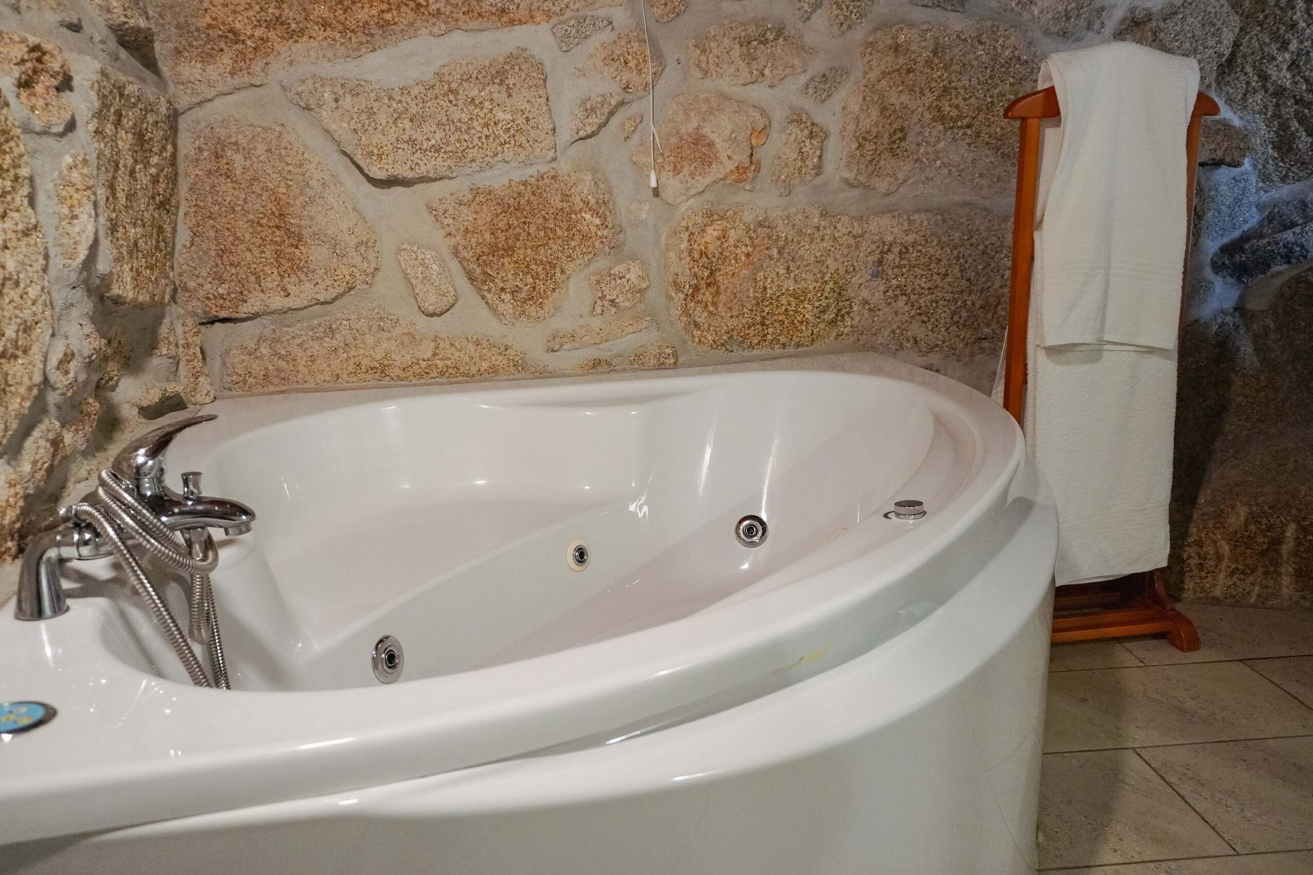 Quarto de aspeto rústico com uma banheira de hidromassagem e uma kitchenette.